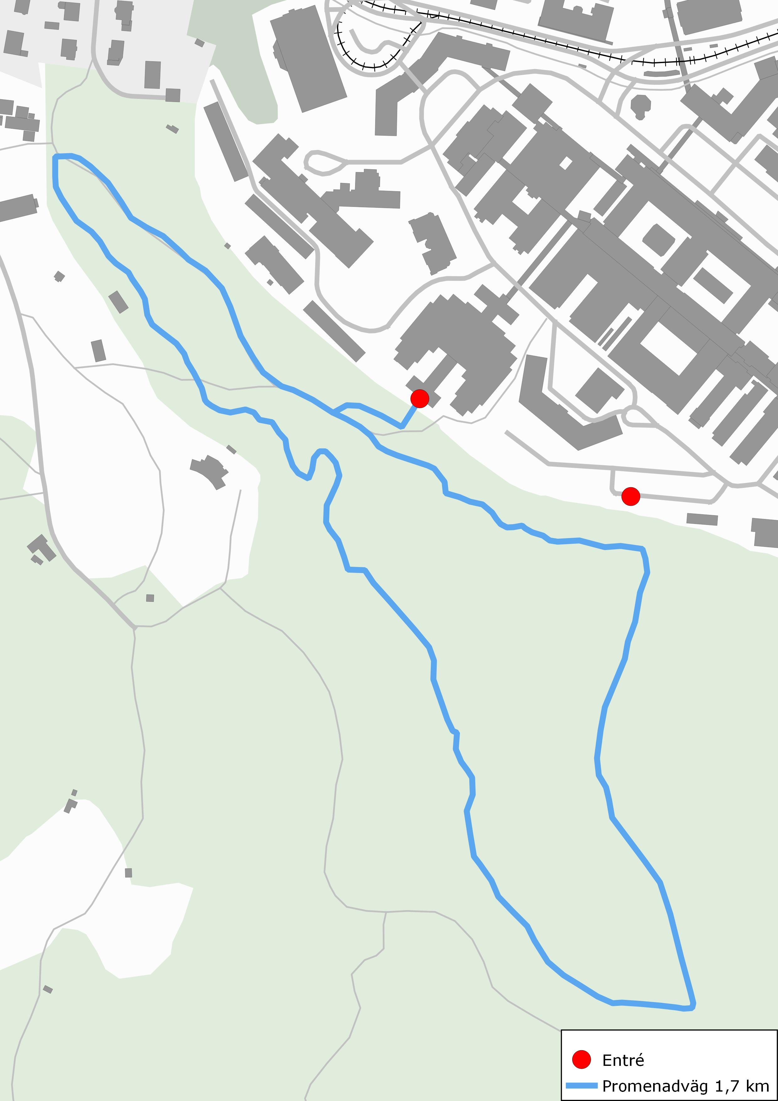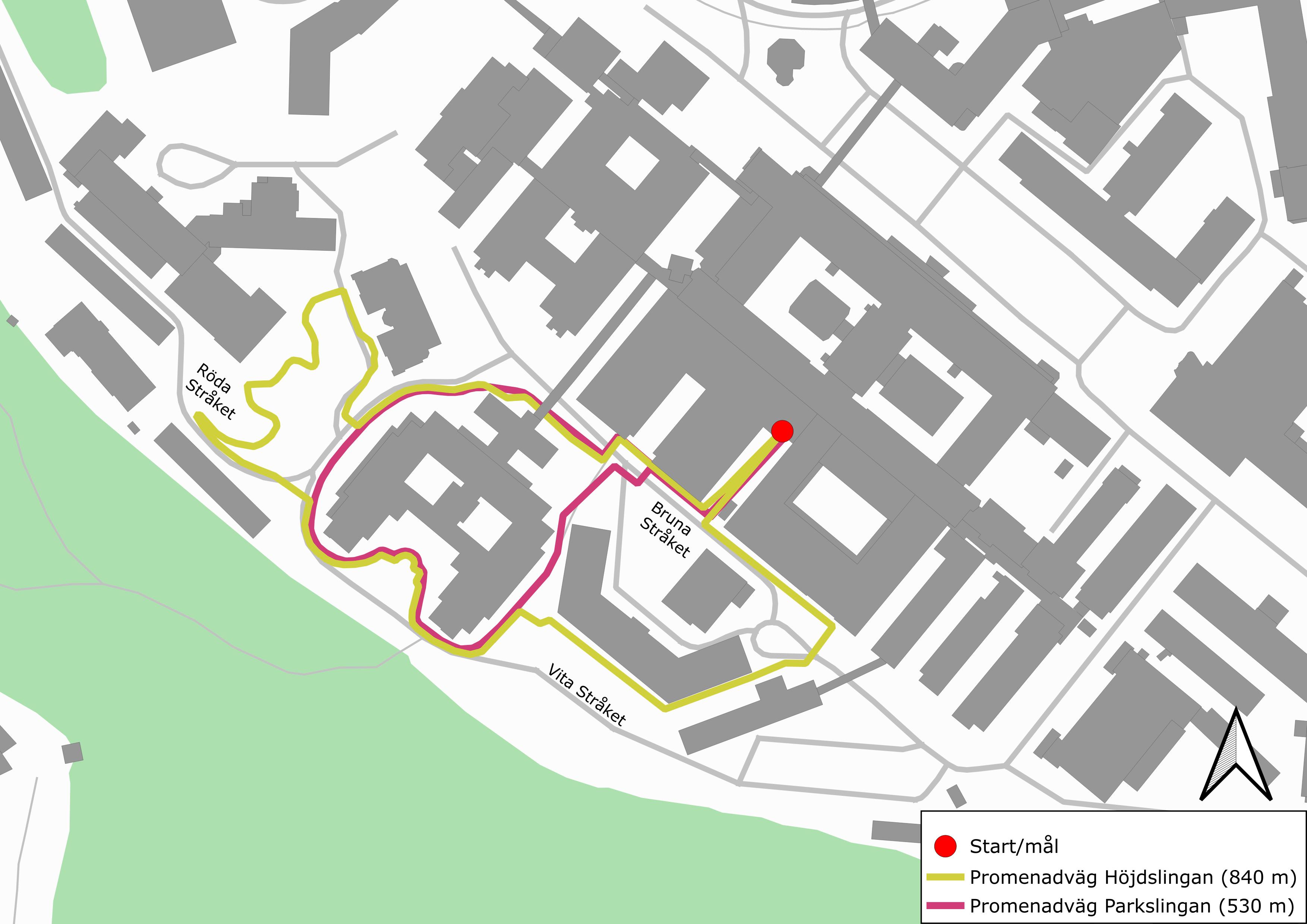 Gå rakt genom centralkomplexet från huvudentrén till utgången mot Bruna stråket för att hitta startpunkten för våra promenadslingor.